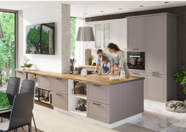 Модульная кухня «Кёльн» бланж софи, тоффи есть стандартные и высокие фасады.