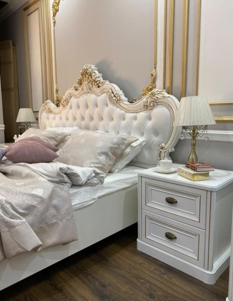 Тумбочка Корпус: ЛДСП Kronospan 16 мм; Фасад: Прямой рамочный МДФ, вставка МДФ 6 мм, рамка МДФ 22мм с каскадной фрезеровкой Топы: МДФ; Цоколь: МДФ; Декоративная обработка фасада: Золотая патина; Фурнитура: Направляющие всех ящиков скрытого типа и оснащены доводчиками; Ручки Salice Италия, форма ракушка. Допустимая нагрузка: На дно ящиков до 3 кг